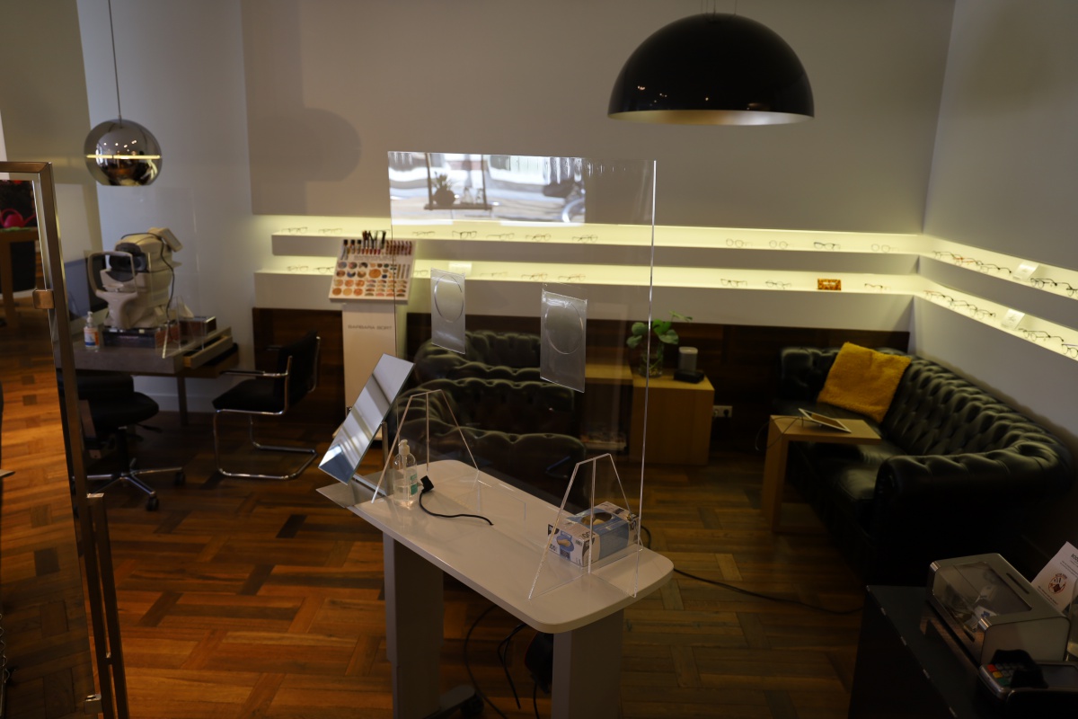 Daarnaast is voor de meetruimte een originele en praktische oplossing bedacht om personeel en klanten tijdens een oogmeting te beschermen. Zo zijn in de meetruimte en voor het passen van brilmonturen bij de adviestafels, schermen geplaatst die voorzien zijn van ronde gaten. Deze gaten worden afgedekt bij het voeren van een adviesgesprek.