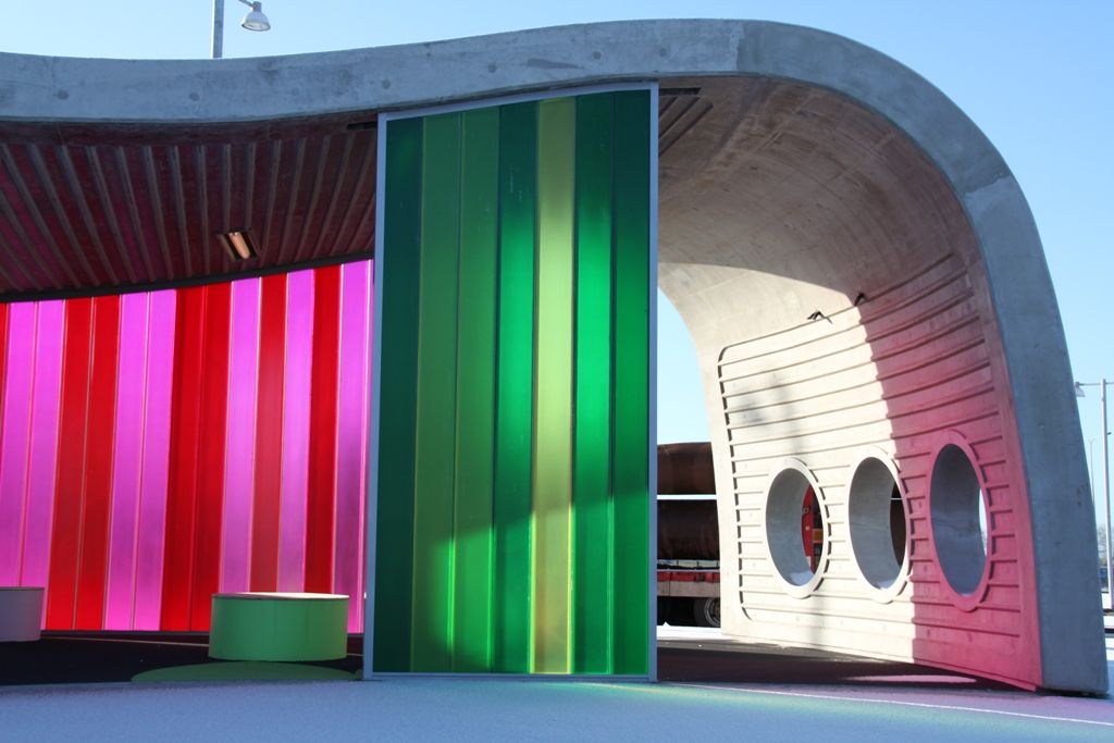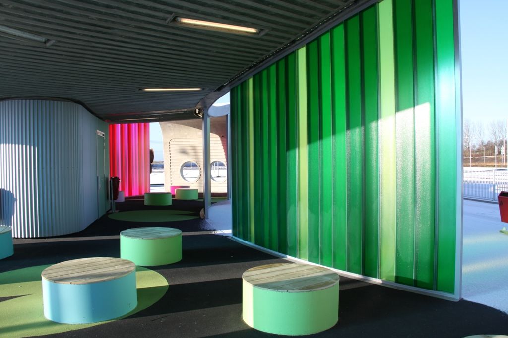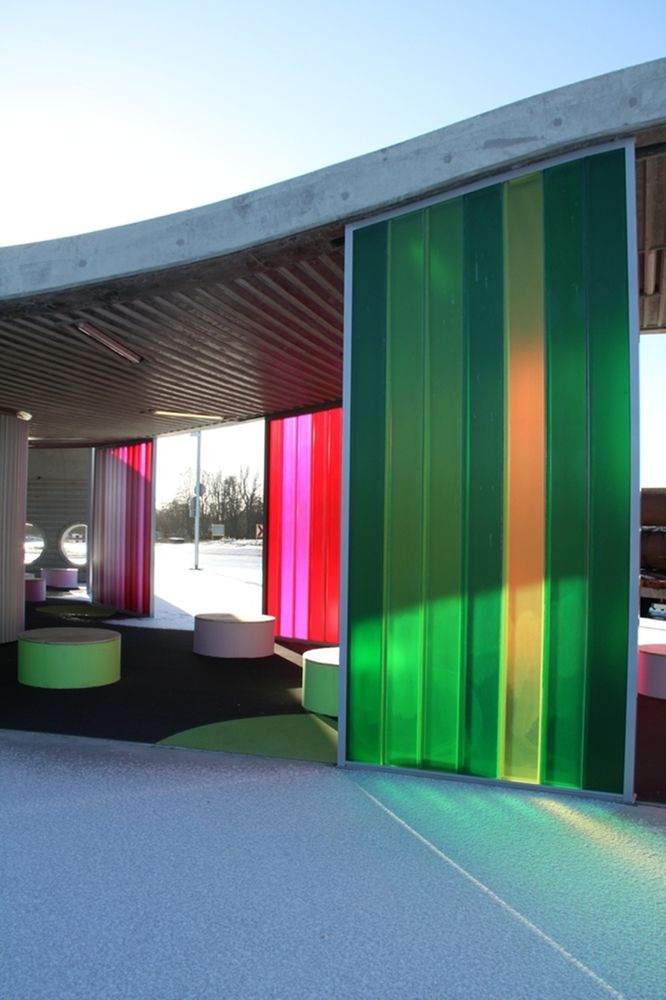 De uitvoering van het product Pilkington Profilit in dit project is voorzien van een transparante kleurfolie. De kleurenschema’s bestaan uit zes verschillende kleuren. De gebruikte kleuren komen overeen met de huiskleuren van de busmaatschappijen die gebruik maken van het Transferium.