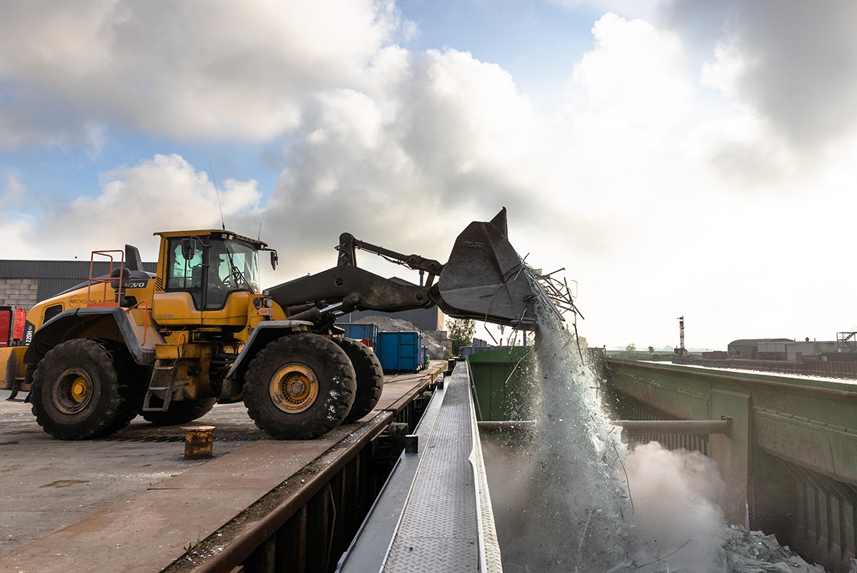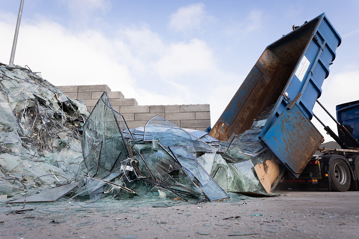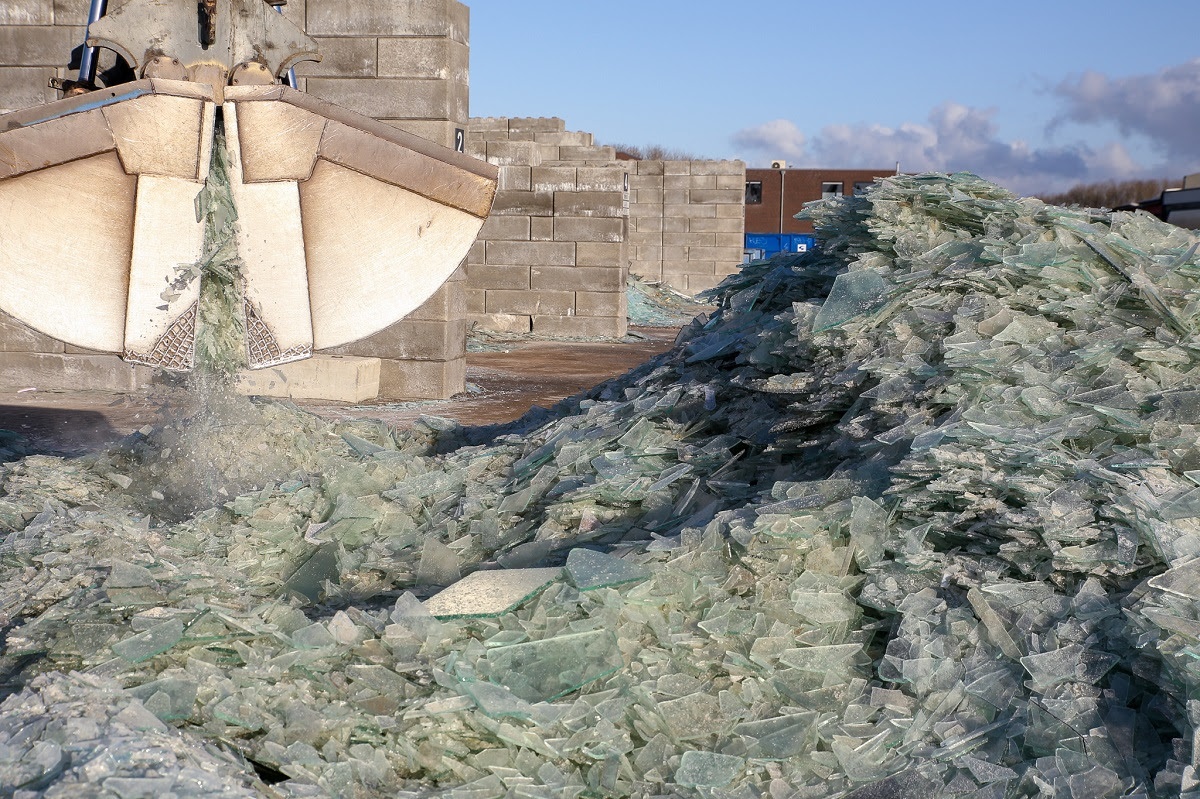 Het recyclingbedrijf sorteert de verschillende soorten vlakglas en slaat dit per soort op.